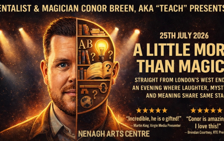 Mentalist & Magician Conor Breen (Teach) Presents: A Little More Than Magic, Saturday 25th July, 8pm, €25 ↓ Scroll down for tickets ↓ Prepare for an unforgettable evening of mystery, mind-reading and astonishing illusions with Irish mentalist and magician Conor...
